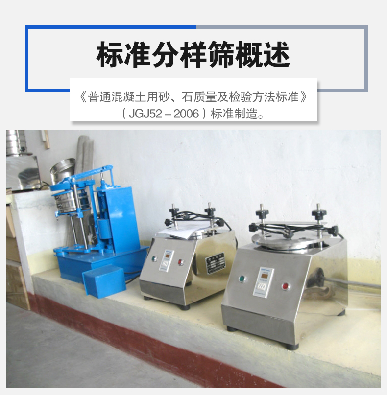 供應(yīng)標(biāo)準(zhǔn)分樣篩供應(yīng)分樣篩是按《普通混凝土用砂、石質(zhì)量及檢驗(yàn)方法標(biāo)準(zhǔn)》(JGJ52-2006),對(duì)顆粒性材料進(jìn)行篩分試驗(yàn)用的符合標(biāo)準(zhǔn)形狀和尺寸規(guī)格要求的系列樣品篩。標(biāo)準(zhǔn)篩篩孔為正方形或圓形,適用于測(cè)定碎石或卵石中的含泥量。
